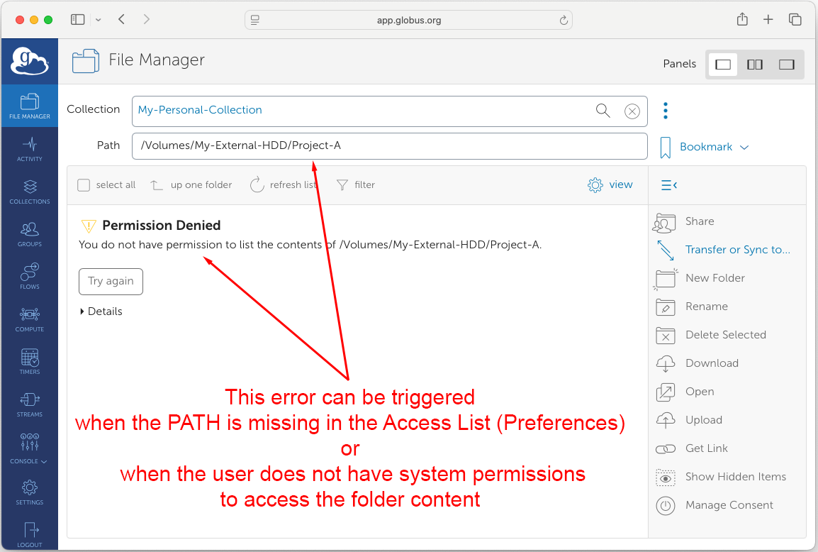 Files stored in other system locations, including external drives, are not accessible unless they are added to the endpoint access list. If a path was not previously added, accessing it through the Globus Web Application might prompt authorization errors.