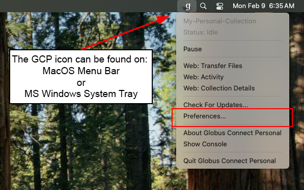 Locate the Globus Connect Personal icon on the system. On macOS, this icon appears in the top menu bar (location may vary on different systems).