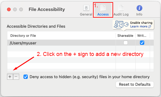 Click on the Access tab to view the list of folders currently shared by your endpoint. On macOS, the home directory is included by default. In the Access tab, click on the PLUS (+) icon to add a new folder to the list of accessible paths. A file manager window will appear and you will be able to browse your file system.