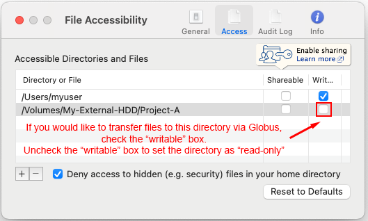 By default, Globus Connect Personal (GCP) allows access only to a limited set of user directories