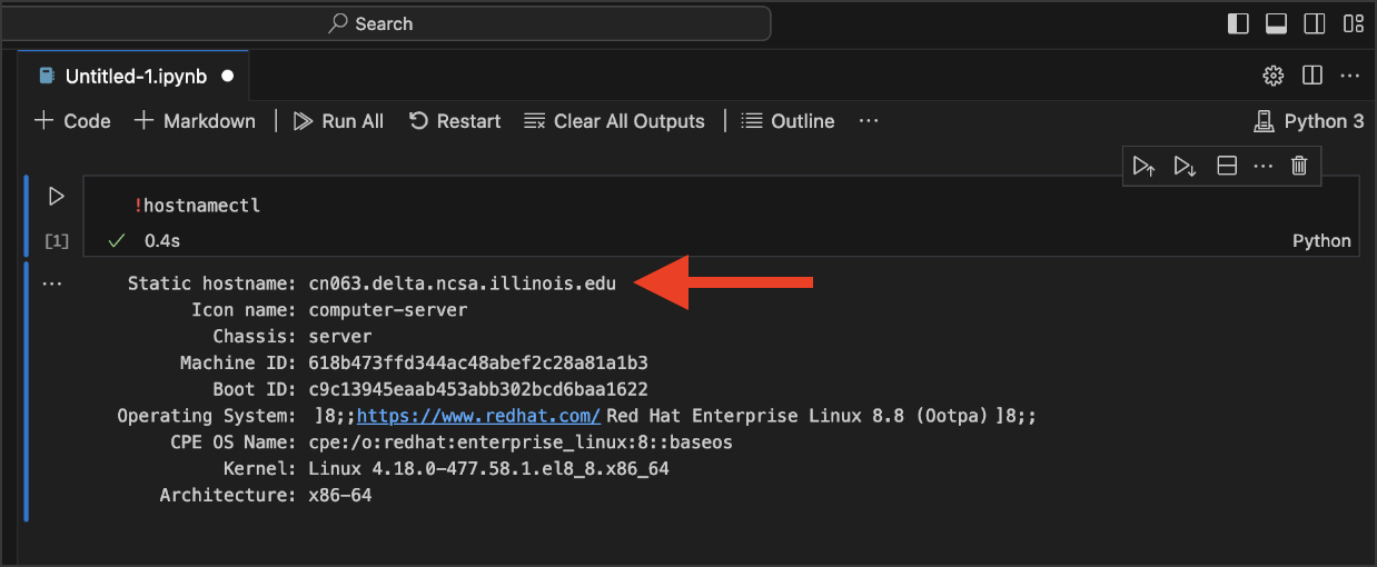 VS Code Jupyter notebook with a cell that ran !hostnamectl and returned static hostname value of a compute node.