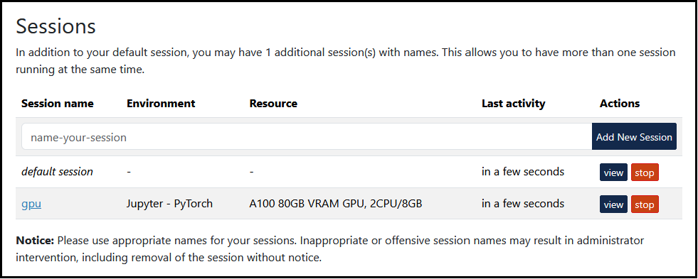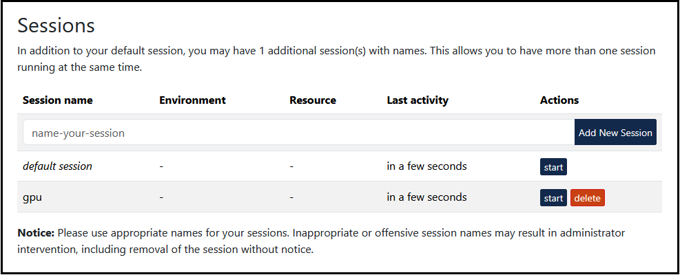 If you have a stopped named session, you can either click start to re-start it or click delete to remove it which would then allow you to add a new named session. If you have a stopped default session, you can click start to re-start it.