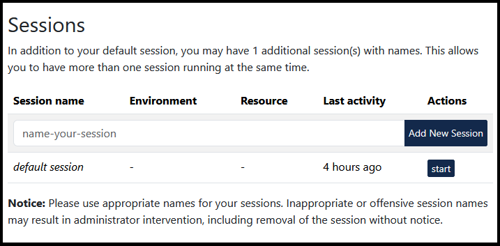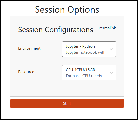 For both the default session or a named session, the next screen will be Session Options. Use the drop-down menus to select the Environment and Resource you want to use and click Start. Go to Resource Limits per User for information about the resource allocations in each option.